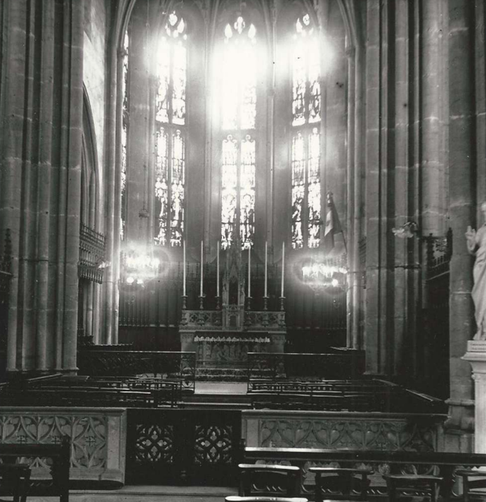 Sur cette photo d'avant 1944, nous voyons la grille de communion en fer forgé, les cancels en pierre et les palissades en bois à leur place d'origine. C'est cette configuration que nous allons retrouver grâce à vos dons généreux.